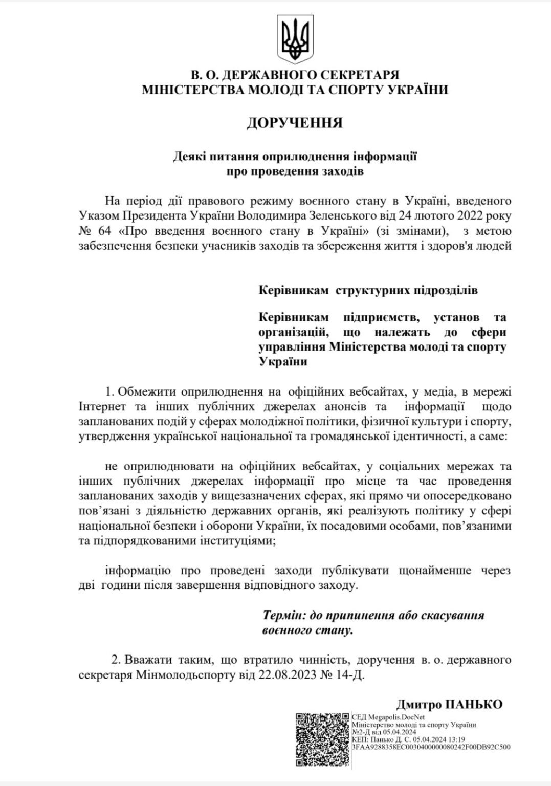 Міністерство молоді та спорту України підписало доручення стосовно питань оприлюднення інформації стосовно проведення заходів. Документ розроблено з метою забезпечення безпеки учасників заходів та збереження життя і здоров'я людей.